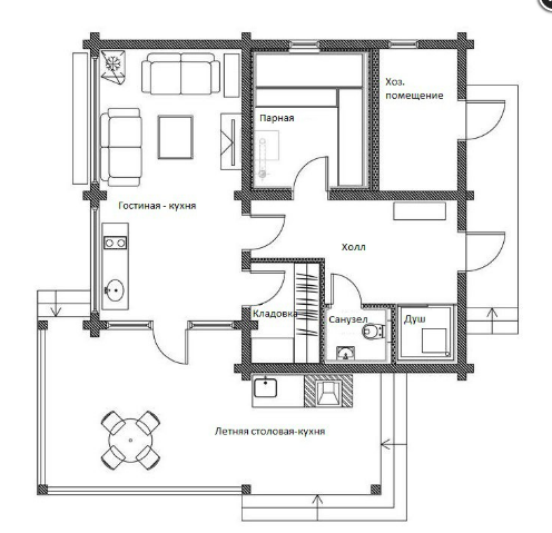 Во внутреннем пространстве гармонично расположены утепленная кухня-гостиная, просторная парная и раздельный санузел.