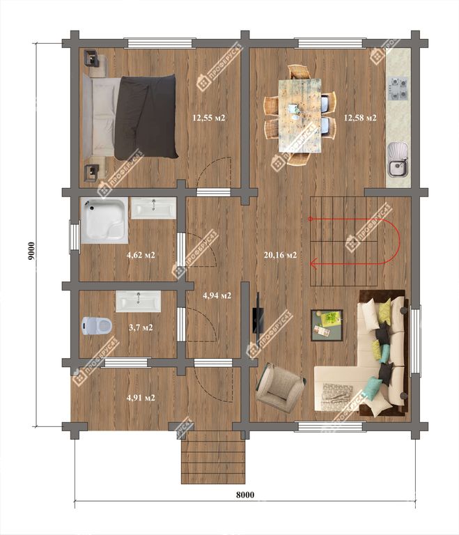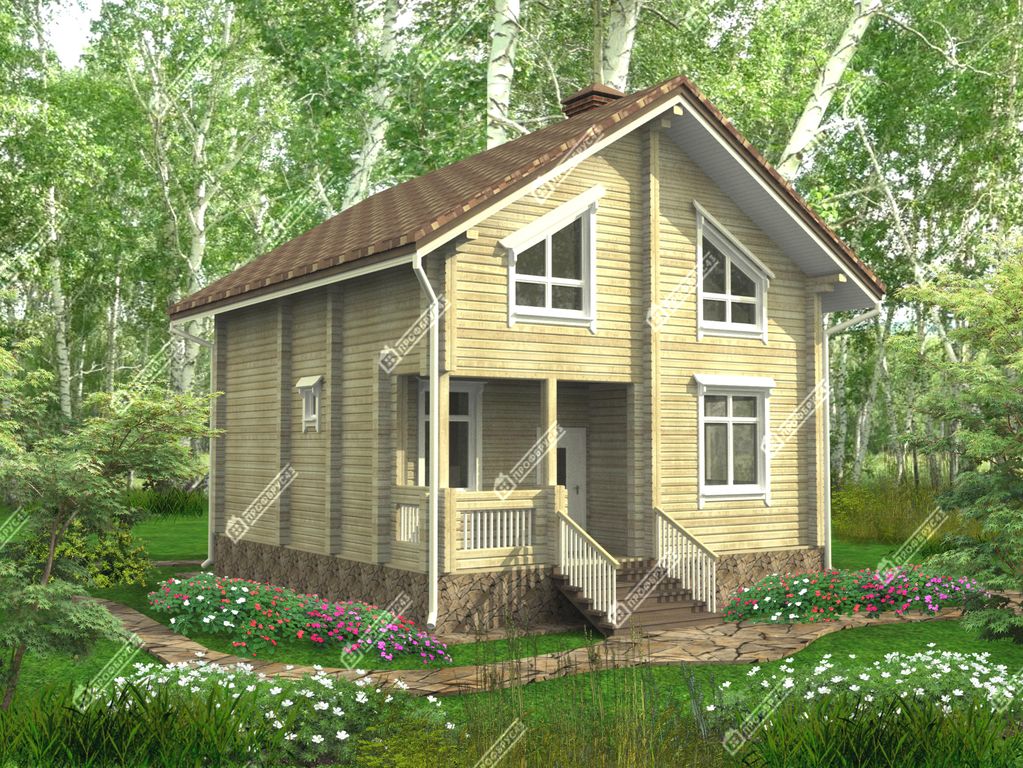 На первом этаже расположены кухня и гостиная, раздельный санузел и спальня. Второй этаж предполагает 4 спальных комнаты и совмещеный санузел.