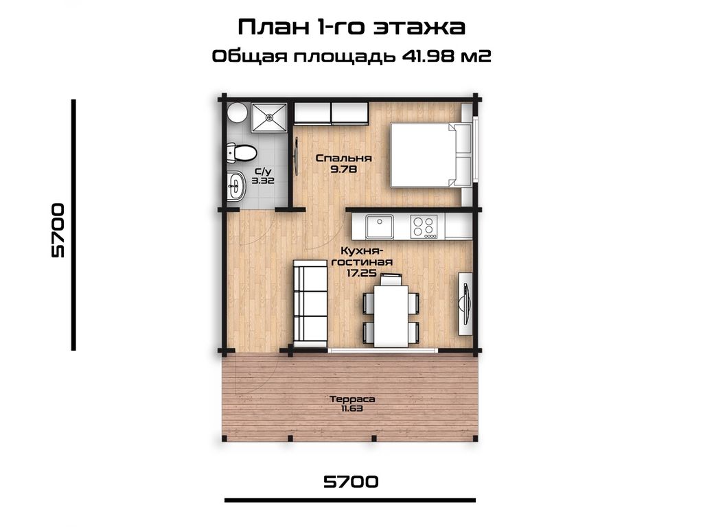 Одноэтажный гостевой дом общей площадью 42 м2.