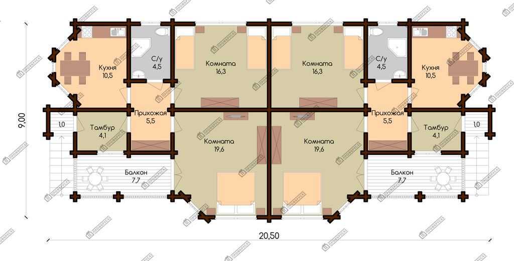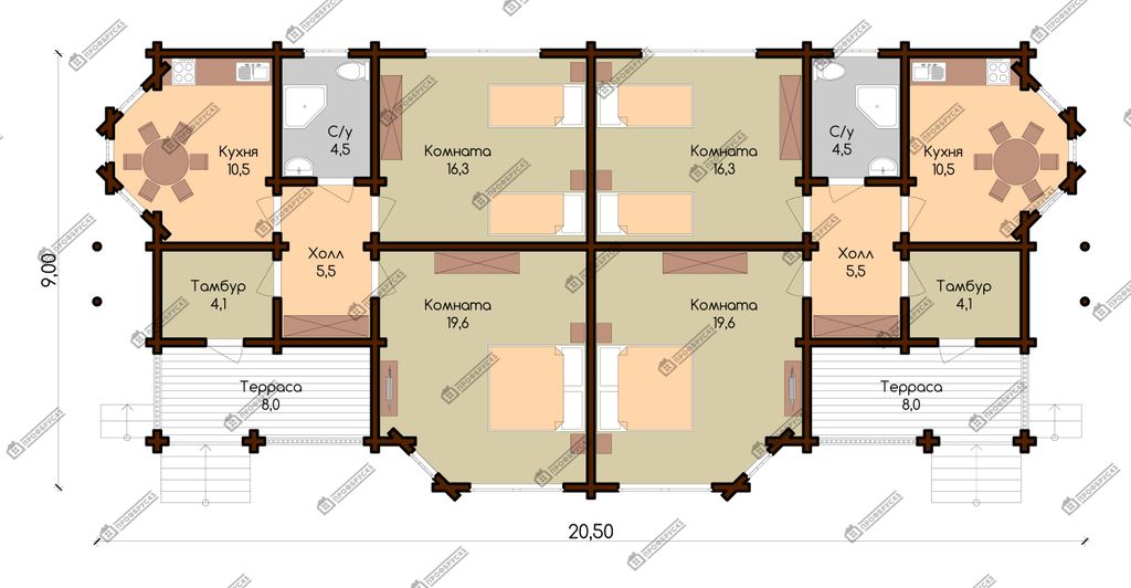Отдельный вход с улицы в каждый номер с полноценными тамбуром и холлом, отдельная кухня для каждого из номеров, а также по две достаточно просторные спальные комнаты. Из каждого номера предполагается выход на балкон или террасу.