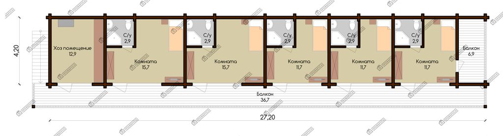 - Количество номеров - 7, санузлов - 7 (2 на первом этаже, 5 на втором этаже).