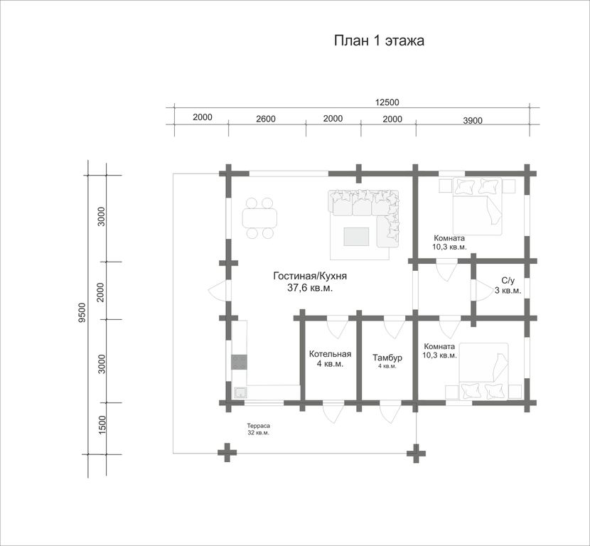 Площадь дома по комнатам 75 м2 плюс терраса 30 м2.